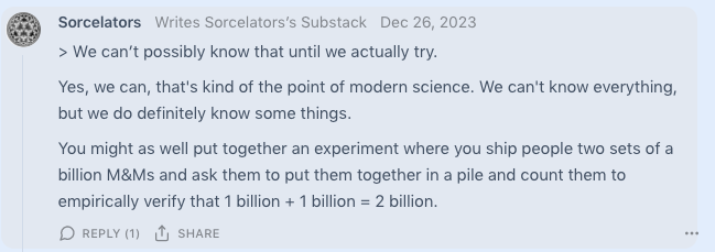Fischbach’s paper now sits at 411 citations. I am sure that many of those question its conclusions, which are certainly not consensus today. For instance, this is a recent paper proposing a mundane explanation for the observed violation. Still, I am not aware of any controversy of this kind surrounding the empirical applicability of arithmetics, even though it happens that Peano was formulating his axioms in 1889 while Eötvös was running his experiment in 1885, making the two roughly contemporaries.