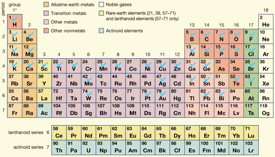 The second consideration is that I want to cover as much of the periodic table as possible. This is how I fared for now: